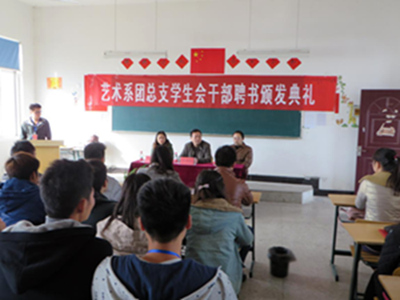 日前,艺术设计系党总支在艺术楼举行仪式,向团总支、学生会干部颁发聘任书。参加大会的有系总支书记王广保、团总支书记白琼、曹明老师以及学生会和团总支所有成员。