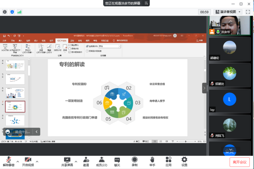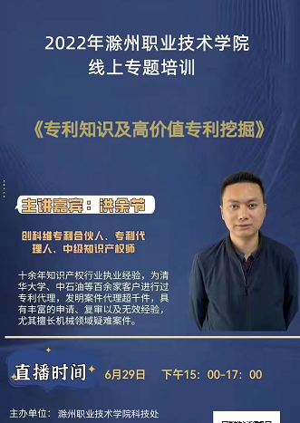 为进一步提升我校专业技术人员科研业务能力,充分促进科技成果转移转化,6月29日下午,科技处面向全体教师开展《专利知识及高价值专利挖掘》主题线上培训。此次培训的主讲人是滁州创科维知识产权代理事务所合伙人、专利代理人、中级知识产权师洪余节。