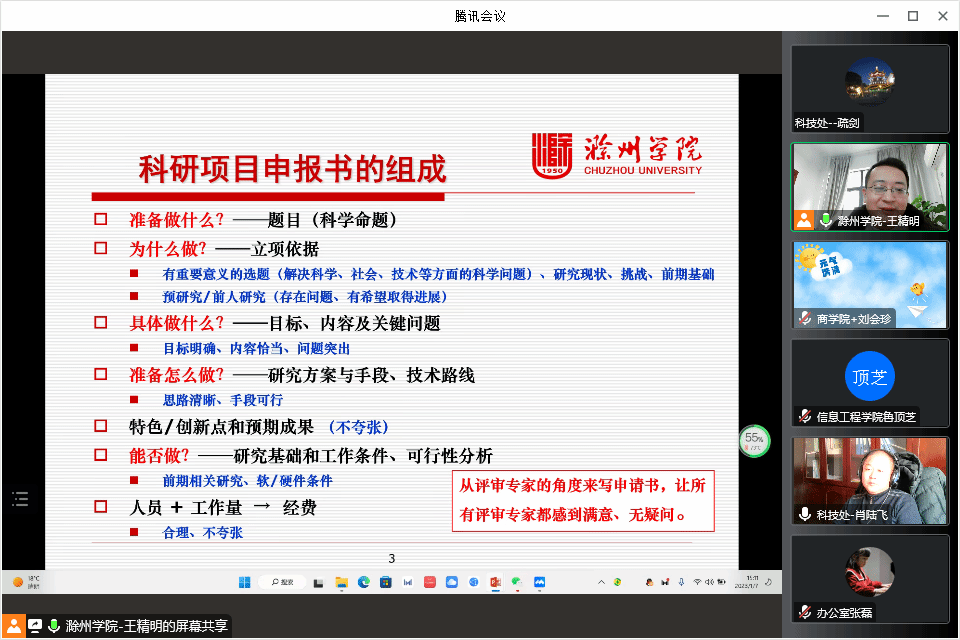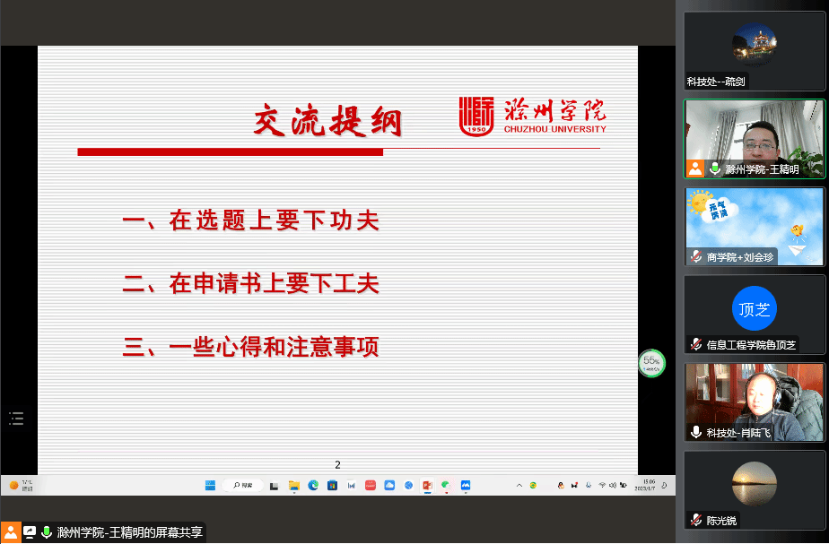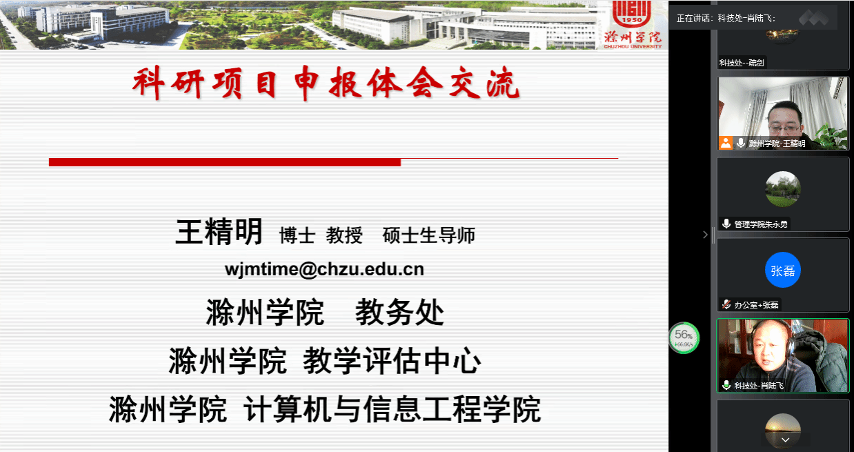 根据学校统一安排,科技处于2023年1月7日组织开展“科研项目申报体会交流”线上会议。本次培训会议由我校科技处处长肖陆飞主持,培训邀请了滁州学院教学评估中心主任兼教务处副处长王精明教授主讲。我校从事科研工作的教职员工参加了本次线上交流会。